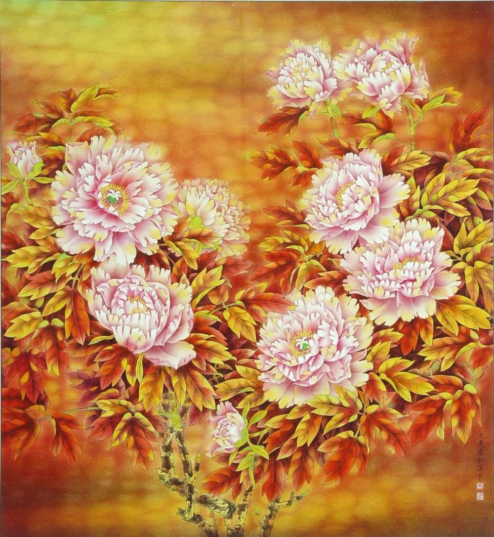 我心中的牡丹:她富丽堂皇,雍容华贵;她热情奔放,流光溢彩。她像燃烧的火,又如喷薄而出的太阳……这就是《丽日》的创作初衷。在画中,我对色彩语言的处理进行了大胆尝试。在色彩运用上,我兼顾色彩的主客观两方面因素,既选择来源于物象的自然色彩,又注入较多主观感情的意象色彩,采取随意赋彩和随情赋彩的方法,以延展传统色彩的表现形式。在染色方面,我没有一味重复传统的色彩渲染技法,而是将背景染出斑驳的光影效果,以增添一种神秘的意韵。在增强色彩的表现力的同时,我注意调和色彩间的微妙关系,通过增减色阶来突出色彩主调,以托出一定的意境气氛,我尽力把握艳丽典雅的基调,力求主题内容同艺术处理相符合,以此赞美牡丹的生命气象。